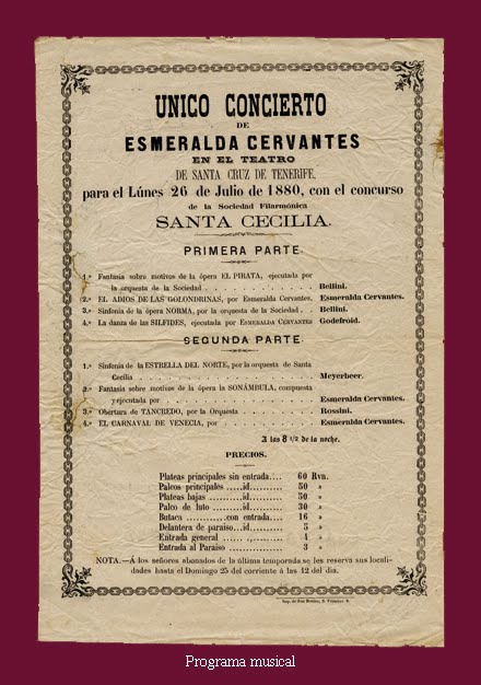 Enfant prodige qui se produisit en public dès l'âge de 13 ans, Clotilde Cerda y Bosch (1861-1926) fut une célèbre harpiste, connue sous le pseudonyme d'Esmeralda Cervantes qui lui aurait été suggéré pour moitié par Victor Hugo (qui fut, avec Wagner et Liszt, parmi ses admirateurs) et pour moitié par la reine Isabel II.